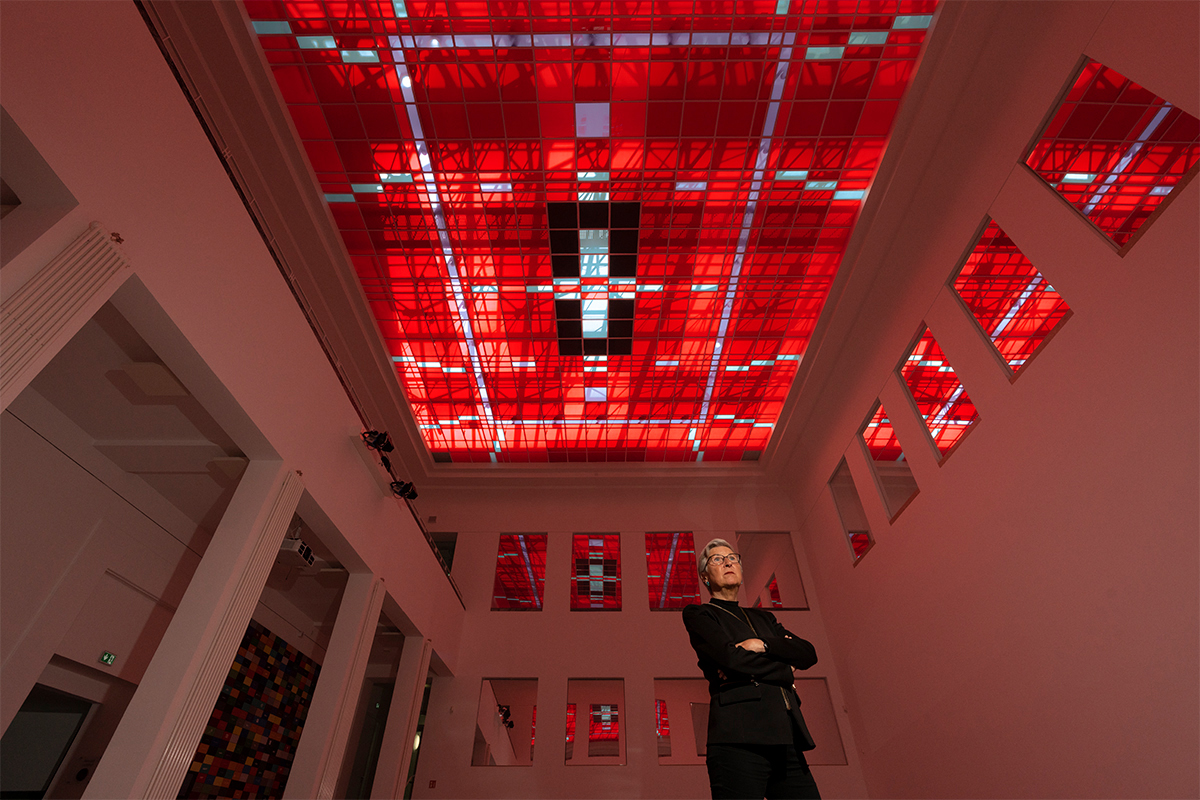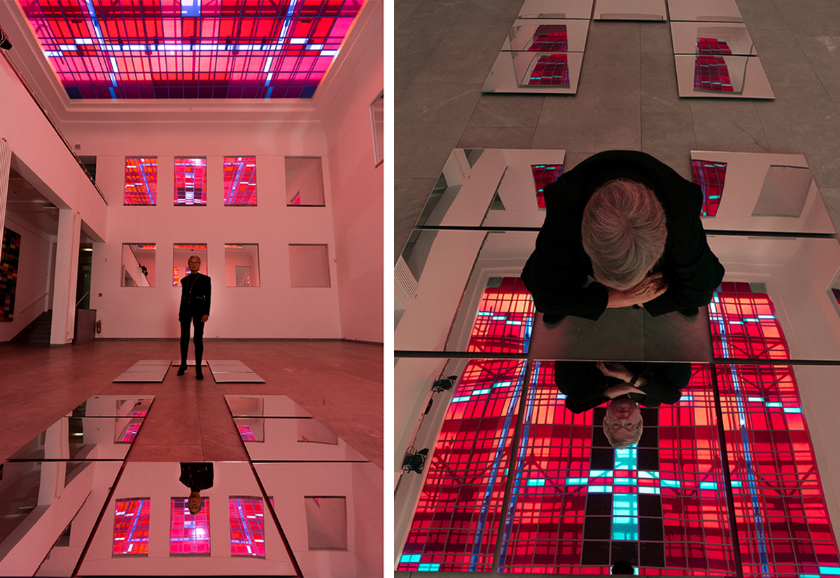 In addition to the chromatic ceiling, 21 aluminum frames lined with mirror foil were integrated into the soffits of the atrium. This created an infinite reflection of the colored glass ceiling from different perspectives. In an interview before the exhibition opened, Elisabeth said: “The atrium will be completely empty. But it will glow! And it reflects! You will see movement in the room where there is none, only your own.”
