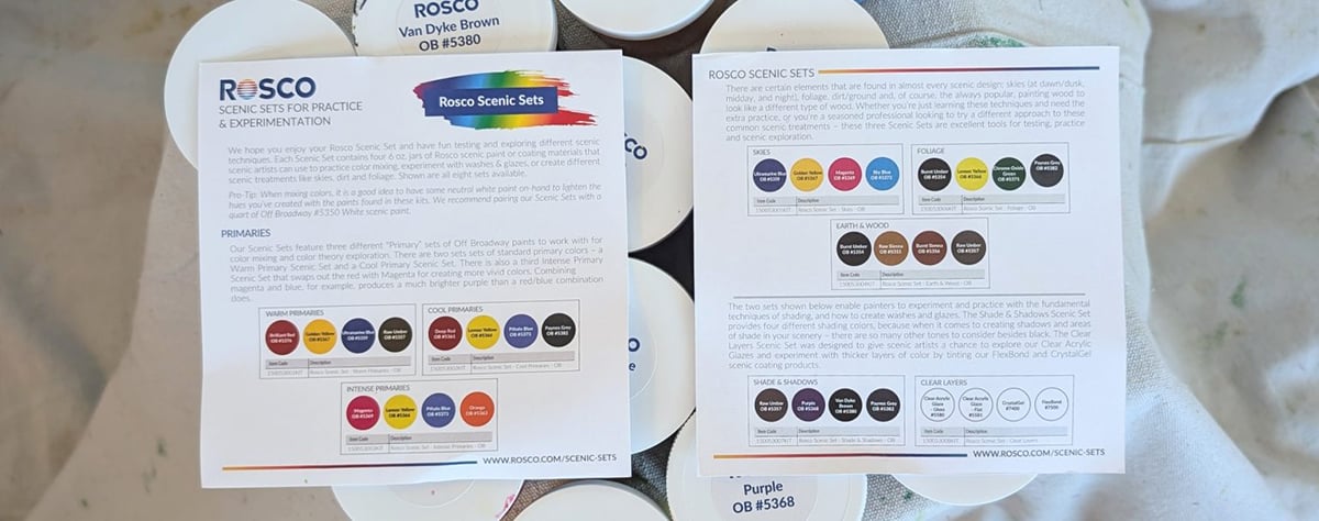 Leveling up your scenic looks might be as easy as leveling up the product lines that you utilize. If you are at the beginning of your scenic paint journey and would like to try these colors on a smaller scale before you make a bigger investment, check out the Rosco Scenic Sets. They give you four colors in each themed kit and can help inform your priority of colors. You can purchase these and all other Rosco products online or through local theatrical and live event vendors near you.