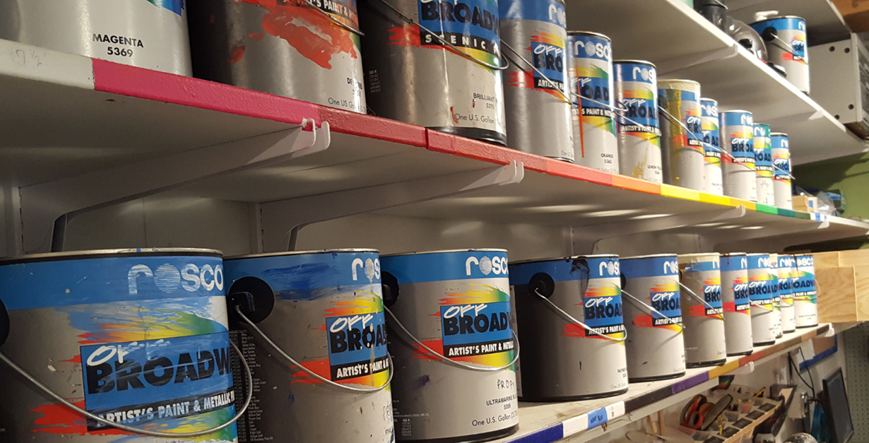 When I became the Charge Artist at a regional theater after the pandemic, one of my first goals was to beef up the Rosco stock. The shelves held a small mix of warm, wood-friendly colors (the siennas, the umbers, Yellow Ochre, and Van Dyke Brown) and a few cool colors (the Pthalos, Paynes, Imperial, and Chrome Oxide Green), in various vintages and untouched for at least two years. To fix this, I first identified the paints needed for the upcoming shows—fortunately not very color‑heavy—which left enough budget to gradually add missing colors. Once we had one of each Rosco Off Broadway color, maintaining and replenishing stock became much easier and ultimately more cost‑effective.